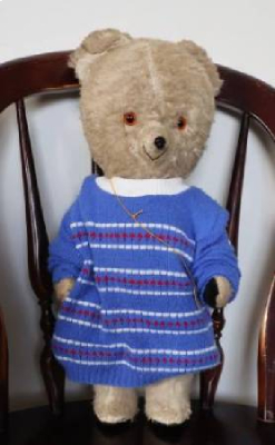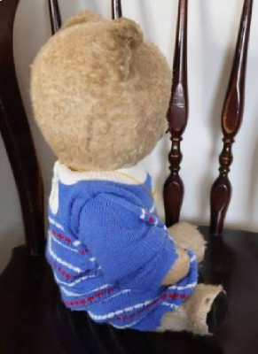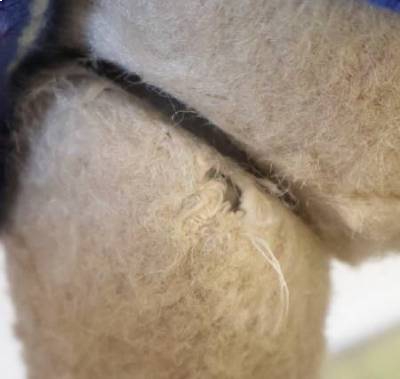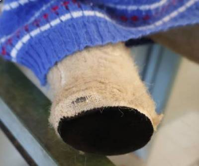 足の先、足の付け根、モヘアが薄くなっていて黒いプラスチック部分が見えています