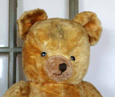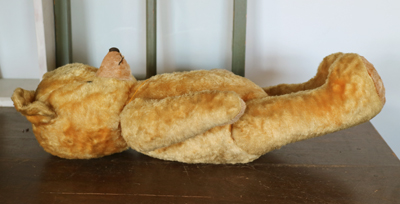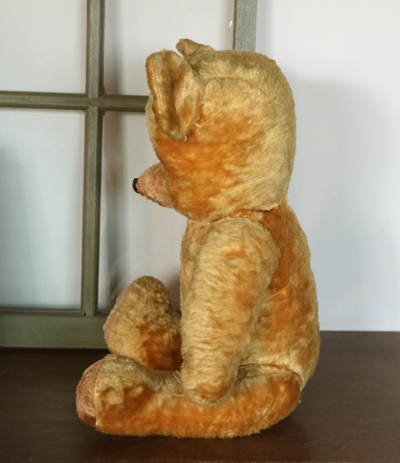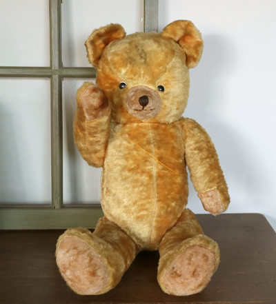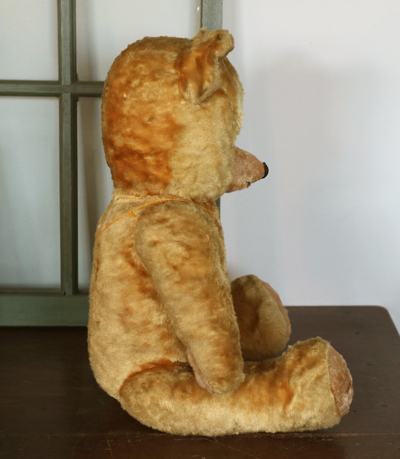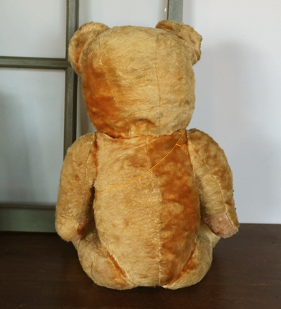| ハンガリー ビンテージベア 特大 OR 四角いお顔がかわらしい ビンテージのベア。 鼻がつんと飛び出た幼顔です。 大き目で、鳴き笛もはいったいてようですが 背中を軽くたたくと、小さく鳴きます。 少し鳴き笛は壊れているようです。 どうぞ仲良くしてあげてください。 ※手足首は動きますが 特に足は固いです。 中の詰め物は固めの木毛のようです。 目はプラスチックアイ。 自分で座ることができます。 頭の上に黒い汚れがあります。 手足など毛の薄い部分があります。 首の後ろに凹みがあり縫い跡が見えます。 vintage、USED品とご理解ください。 <サイズ>身長58p 横幅30cm 厚み19p <買付国>ハンガリー <年代>不明 |