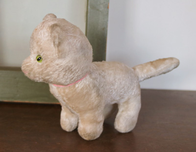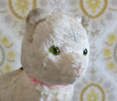 | チェコ 白ねこ グラスアイ チェコで出会った白いねこ。 きれいなグリーンのアーモンドアイは グラスアイ。 ちょっと足の短いのも愛嬌でかわいいです。 少し右に傾いていて、右後ろの足は浮いています。 体は固く、詰め物はおそらく木毛。 どうぞ仲良くしてあげてください。 ※しっぽの付け根部分、糸がほどけかかっています(4枚目) 他、経年による細かな汚れなどあります。 vintage、USED品とご理解ください。 <サイズ>高さ12.5p 厚み5.5p(正面から) 横幅18.7p(鼻から尻尾まで) <買付国>チェコ <年代>不明 |