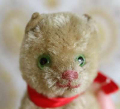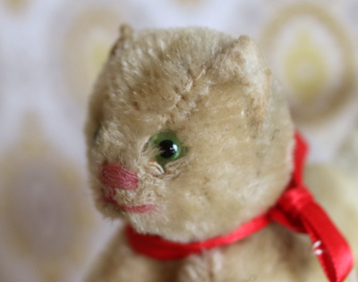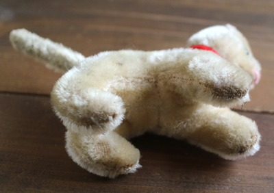 | ドイツの蚤の市で出会った 赤いリボンをしたちびねこ。 赤いリボンは前の持ち主につけてもらったようで 新しいです。 シュタイフといわれましたが 定かではないため、シュタイフ風です。 うっすらトラ柄模様の子です。 てのひらぐらいのサイズの小さめです。 グラスアイ。詰め物はおそらく木毛です。 尻尾の先、体の一部のモヘアがハゲています。 向かって右側の目の周りの毛に乱れがあります。 vintage、USED品とご理解ください。 <サイズ>身長10.5p 横幅13cm 正面から幅5cm <買付国>ドイツ <年代>不明 |