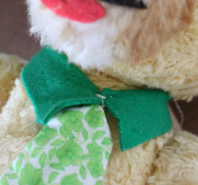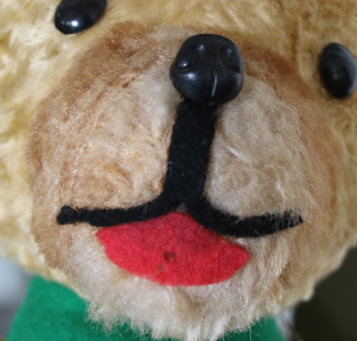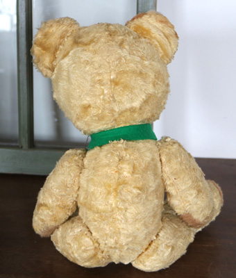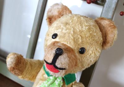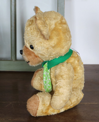 | 緑のネクタイをしたベアさん。 舌をぺろりと出した 幼顔の子です。 片耳や片手の先、鼻の周りなどが まだらになっているのもかわいいポイントです。 手のジョイントが見えていたので 修繕しました。 手足首は動きます。 プラスッチクアイ。 詰め物は綿です。 自分で座ることができます。 舌や襟のフェルトに少し虫食いがあります。 vintage、USED品とご理解ください。 <サイズ>身長40p 座って30p 横幅21cm <買付国>ドイツ <年代>不明 |