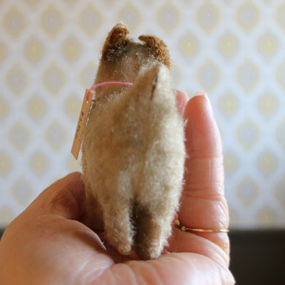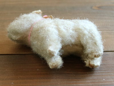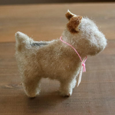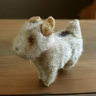 3匹色違いの子のうち ぶち犬さんです。 ハンガリーの蚤の市からやってきました。 うまくバランスを取らないと 立ってくれいない子ですが 小さめでかわいいです。 目はオレンジのプラスチックアイ。 全体的に固くいです。 サイズ:高さ7p 横幅8cm(頭から尻尾まで)厚み2.5p(正面から見て) |
