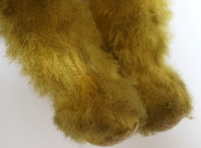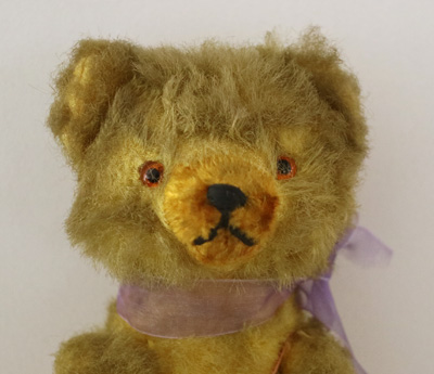 | 目はグラスアイ。 鼻の周りの毛は少し薄くなっています。 紫のリボンは付けてもらったのでしょうね。 |