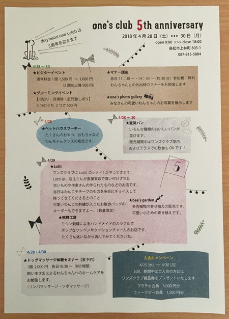 高松市林町にある「one's club」さんの5周年イベントに出店します。
