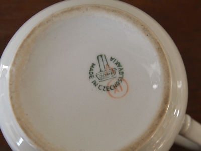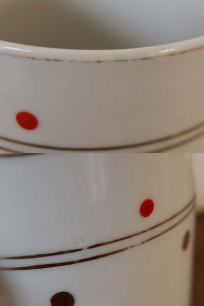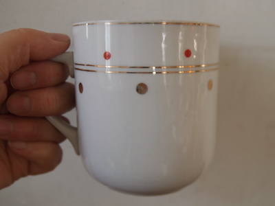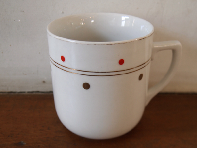 | プラハのバザール(古道具屋)で見つけた 赤と金の水玉が柔らかな雰囲気のマグカップです。 小さ目の水玉模様が 規則的に並んでいて、レトロな風合いたっぷりです。 大きめで、カフェオレやミルクティーをいれて たっぷりと飲んでくださいね。 チェコスロヴァキア時代のものになります。 口部分や金縁などのはがれがあります。 そのほかは気になる点は特にはありません。 USED品、古いものとご理解いただけますようお願いします。 <strong>※価格変更後の表記です。</strong>※ <サイズ>口径8.2cm 高さ約9cm |