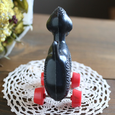 プラスチックのわんこ。 黒いプードルのようですね。 赤い目がポイントです。 足のコマもきちんと回ります。 ちょこんと飾ってあげてくださいね。 ※経年によるプレスチックの細かな傷があります。 また作りの荒い部分もあります。 vintage、USED品とご理解ください。 <サイズ>横幅7.2p H9.0cm 厚み4.5cm <買付国>チェコ <年代>不明 |